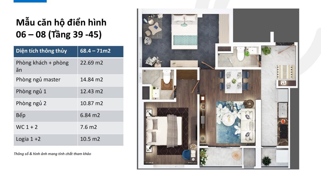 - Căn hộ 2 ngủ : 68.72 m2, 71.07 m2, 74.3 m2, 74.8 m2